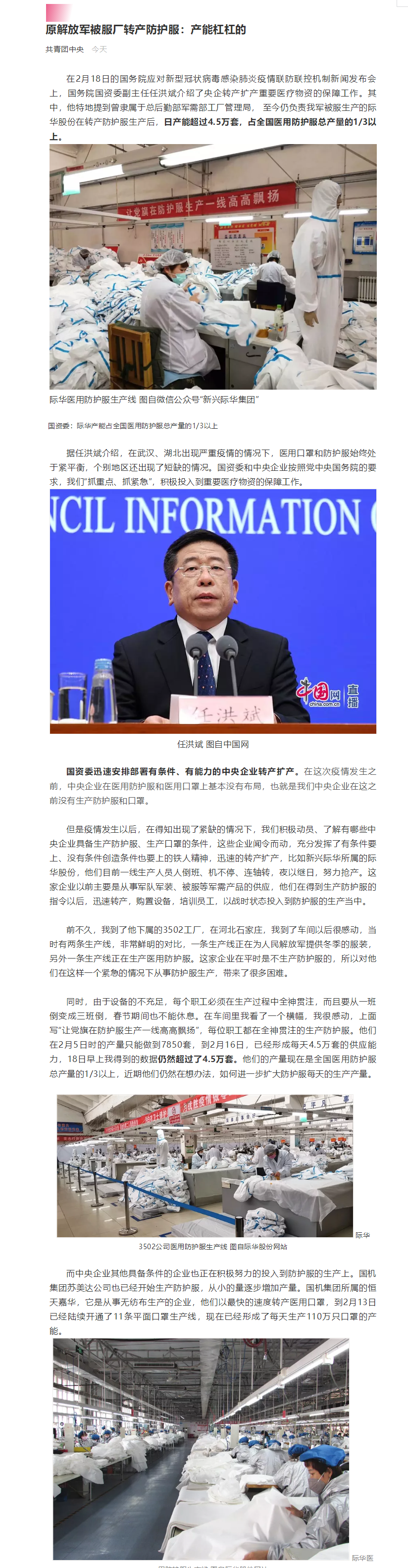 《共青團中央》原解放軍被服廠轉産防護服:産能杠杠的