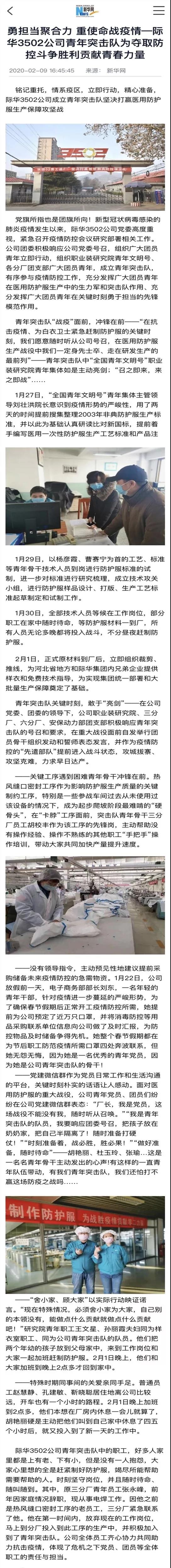 《新華網》勇擔當聚合力 重使命戰疫情—华体会体育app下载官方首页3502公司青年突擊隊為奪取防控鬥争勝利貢獻青春力量