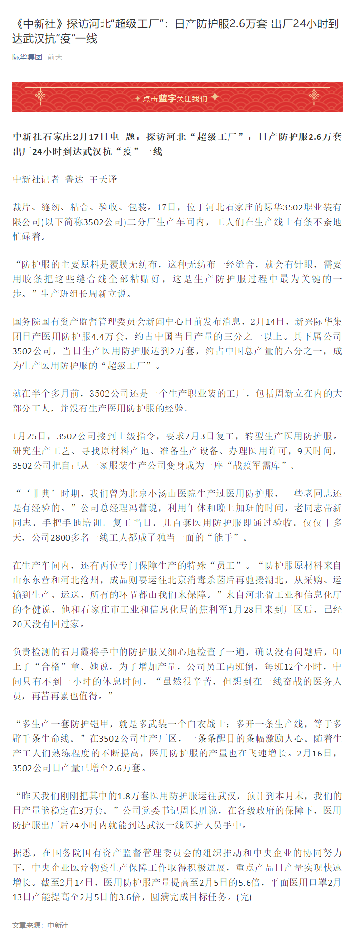 《中新社》探訪河北“超級工廠”:日産防護服2.6萬套 出廠24小時到達武漢抗“疫”一線